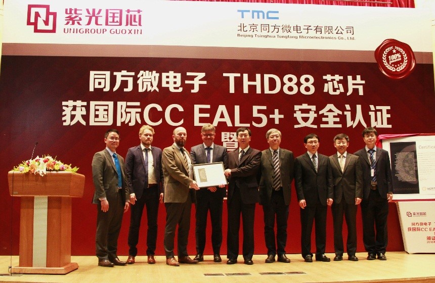 2016年4月20日,北京同方微电子有限公司(以下简称“同方微电子”)在北京清华同方科技广场C座国际报告厅召开CCEAL5+颁证典礼,挪威SERTIT安全认证部主任Kjartan正式向同方微电子总裁段立颁发了国际CCEAL5+安全认证证书,标志着公司自主研发的双界面金融IC卡芯片THD88/M2064(以下简称“THD88”)成为国内唯一一款获得该认证的芯片产品。mile米乐股份有限公司(原名:同方国芯电子股份有限公司)领导、挪威SERTIT认证机构代表、荷兰Brightsight实验室代表、30多家合作伙伴代表、同方微电子公司全体员工共三百余人一起见证了这一历史时刻。